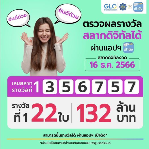 ข่าวหวยวันนี้ รายงานว่า หลังการออกสลากกินแบ่งรัฐบาล งวดประจำวันที่ 16 ธันวาคม 2566 โดยรางวัลที่ 1 หมายเลข 356757, เลขหน้า 3 ตัว หมายเลข 058 และ 410, เลขท้าย 3 ตัว 964 และ 584, เลขท้าย 2 ตัว หมายเลข 85 ข่าวคนถูกสลากดิจิทัล โดยเฟซบุ๊กเพจ Krungthai Care แจ้งว่า สลากดิจิทัล งวด 16 ธ.ค. 66 เลขสลากรางวัลที่ 1 : 356757 มีคนถูกรางวัลที่ 1 ข่าว คนถูกสลากดิจิทัล งวดนี้ รวม 22 ใบ 132 ล้านบาท ถูก 1 ใบ จำนวน 10 คน ข่าวหวยล่าสุด ถูก 2 ใบ จำนวน 3 คน ถูก 6 ใบ คนถูกสลากดิจิทัล ล่าสุด จำนวน 1 คน ทั้งนี้ สามารถตรวจผลการถูกรางวัลสลากดิจิทัล และสามารถขึ้นรางวัลได้ ผ่านแอปฯ เป๋าตัง รายละเอียดเพิ่มเติม สำหรับงวดหน้า คนถูกสลากดิจิทัล งวดนี้ เริ่มซื้อได้ตั้งแต่ 06.00-23.00 น. ของวันถัดไป หลังจากวันออกรางวัล เงื่อนไข https://www.lekdii.com เป็นไปตามที่สำนักงานสลากกินแบ่งรัฐบาลกำหนด