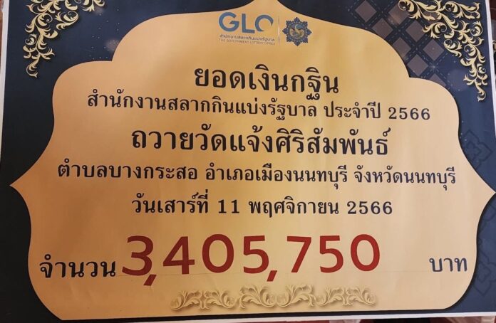 เลขยอดกฐินวัดแจ้งศิริสัมพันธ์ หรือ วัดแจ้งศิริสัมพันธ์ นั้น เป็นวัดราษฎร์สังกัด คณะสงฆ์ฝ่ายมหานิกาย ตั้งอยู่ใน ตำบลบางกระสอ อำเภอเมืองนนทบุรี จังหวัดนนทบุรี ปัจจุบัน พระโสภิตกิตติธาดา ดำรงตำแหน่งเจ้าอาวาส วัดแจ้งศิริสัมพันธ์ สร้างขึ้นเมื่อ พ.ศ. 2360 โดย ข่าวหวยงวดนี้ ณ วัดแจ้งศิริสัมพันธ์ อำเภอเมือง จังหวัดนนทบุรี ยอดเงินกฐิน ที่สำนักงานฯและประชาชนผู้มีจิตศรัทธาทำบุญร่วมกัน เป็นเงินทั้งสิ้น 3,405,750 บาท โดย บรรดาประชาชนผู้นิยมซื้อลอตเตอรี่ ได้นำเลข ข่าวหวยวันนี้ ชุดดังกล่าว ไปเสี่ยงดวง ซื้อลอตเตอรี่กัน คึกคัก โดยหวังว่า จะถูกรางวัลในวันที่ 16 พ.ย.2566 นี้ นั่นเองค่ะ